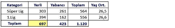 * Süper Lig ve 1. Lig’de oynayan oyuncu sayısı : 1.120.. Evet sadece 1.120.. Bunların sadece 697’si T.C. vatandaşı.. Bu 697 sayısına Gurbetçiler de dahil..